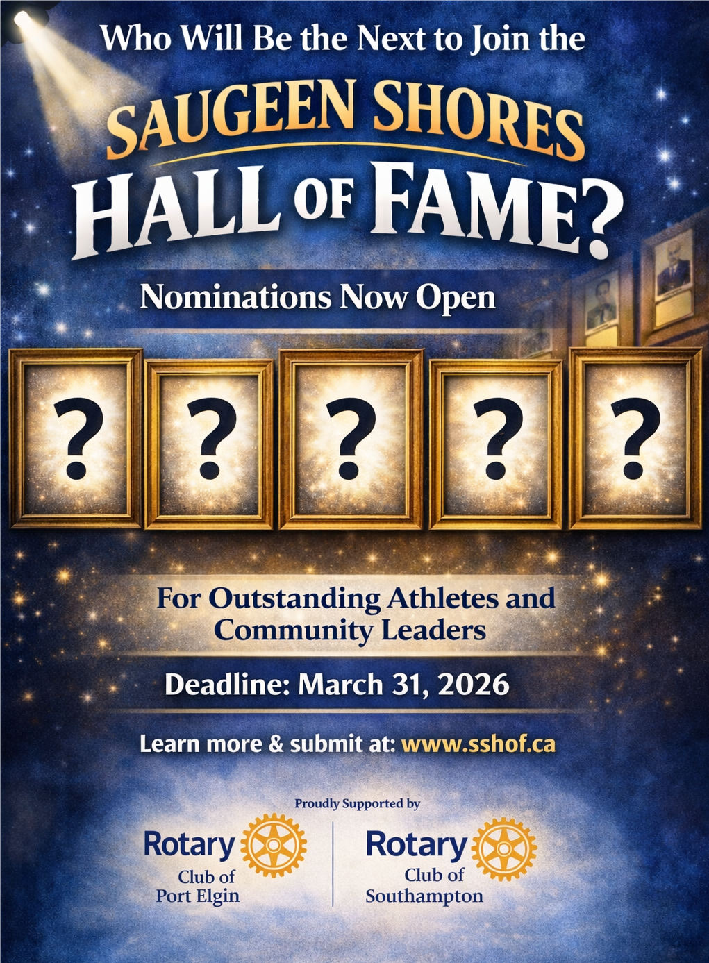 Who Will Be the Next to Join the Saugeen Shores Hall of Fame? Nominations are now open for the 2026 Saugeen Shores Hall of Fame Induction Ceremony. Since its creation in 1999, the Hall of Fame has proudly recognized 49 outstanding individuals, teams, organizations, and events whose achievements have helped shape the spirit and success of our community. Do you know someone whose accomplishments deserve to be celebrated and remembered? Now is your chance to ensure their story becomes part of Saugeen Shores history. Nominations are being accepted for our next Induction Ceremony on June 3, 2026, at the Plex. A detailed nomination outlining the candidate’s accomplishments must be submitted by March 31, 2026. To learn more about past inductees and the nomination process, visit www.sshof.ca. The Saugeen Shores Hall of Fame is proudly supported by the Rotary Club of Port Elgin and the Rotary Club of Southampton. Over the coming weeks, we will also be highlighting some of our past inductees. Their inspiring stories remind us just how much talent, dedication, and community spirit exist right here in our Town. Help us honour the people who make our community extraordinary. Submit a nomination now!