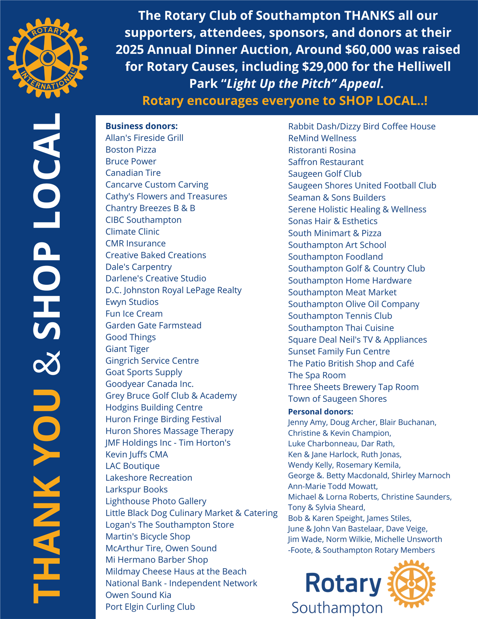 Since 2003, the Southampton Rotary Club has hosted its Annual Dinner and Auction every October, with a brief pause in 2020 and 2021 due to the COVID-19 pandemic.